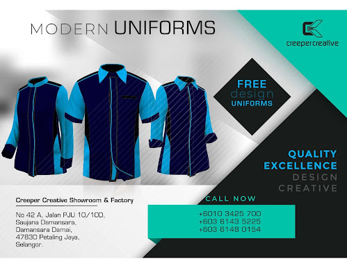 Creeper Creative adalah pengeluar dan pembekal seragam khas. Lebih 12 tahun pengalaman dalam menyelesaikan masalah tempahan seragam customade. Tiada masalah saiz dan pelanggan berpuas hati dengan fabrik dan reka bentuk mengikut cadangan yang telah dipersetujui.